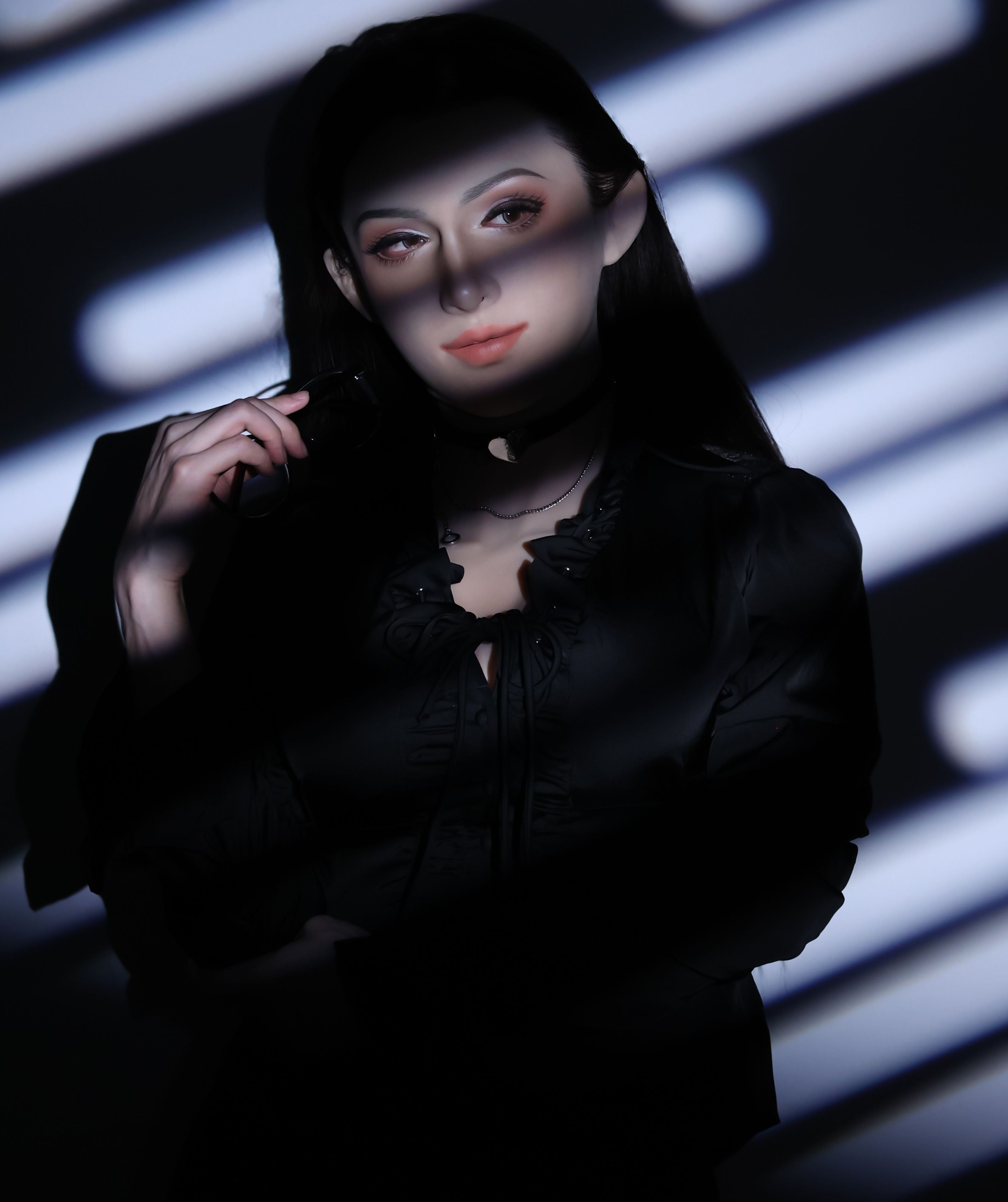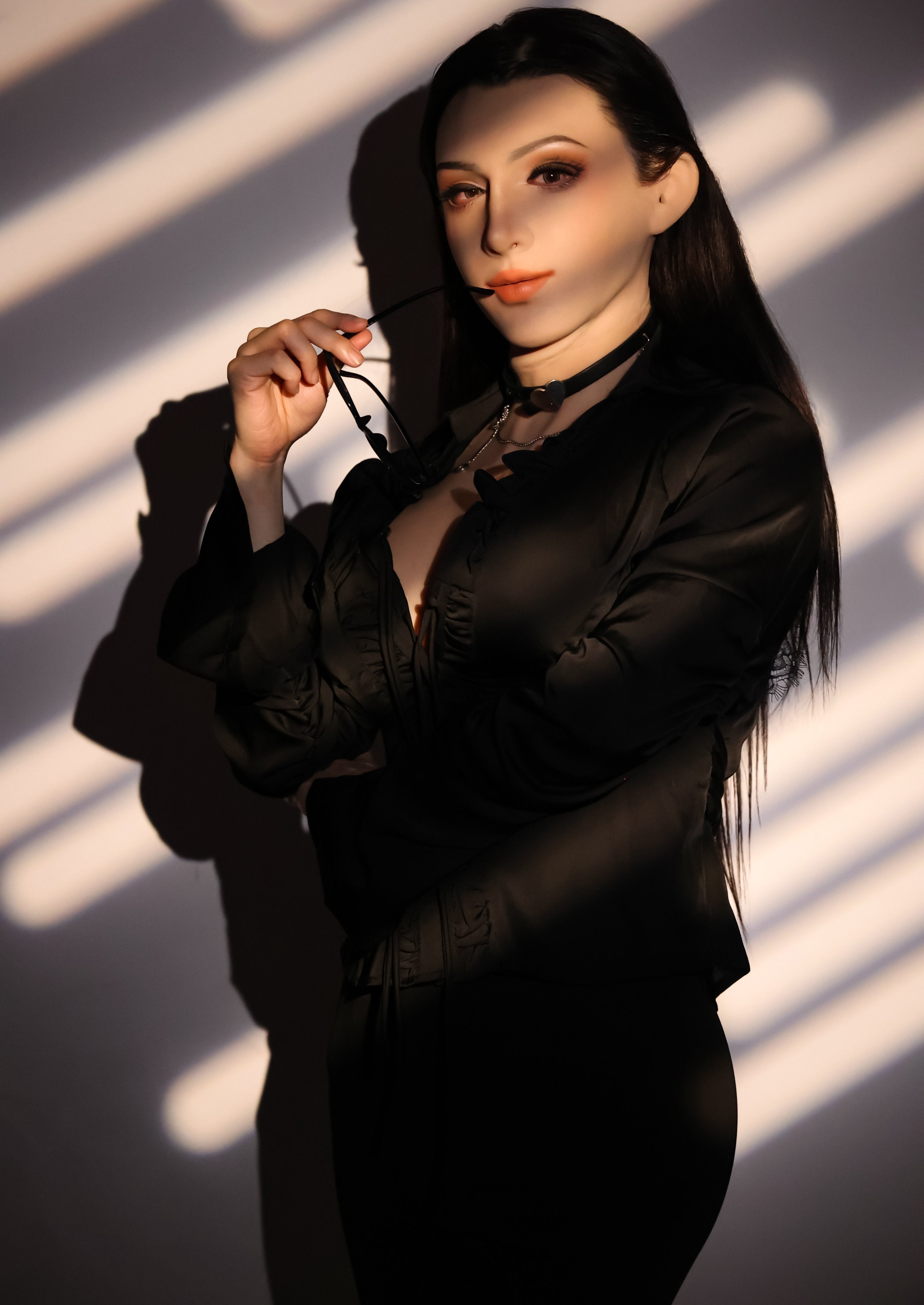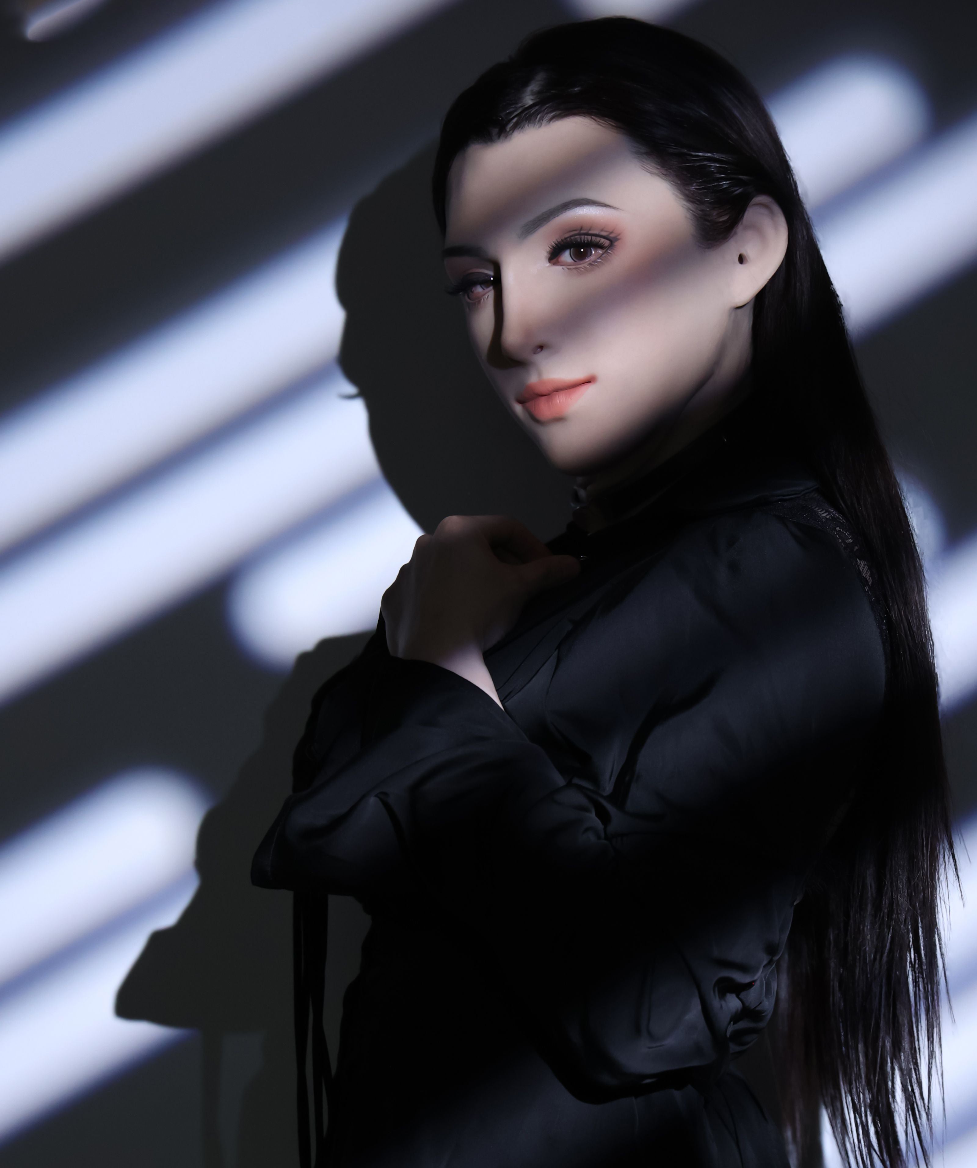 Made from premium stretchable silicone, it offers a soft, skin-like texture that adjusts naturally to facial contours. The surface is smooth and detailed, with refined makeup tones that create a natural, polished finish. The design allows for full facial coverage while maintaining flexibility and breathability.